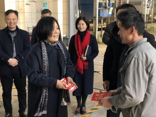 声声问候暖人心,,,,,,句句祝福传真情。。。。。1月20上午,,,,,,集团党委书记施素梅一行带着新春的祝福与关怀,,,,,,来到钱江水处理厂,,,,,,看望慰问在岗职工,,,,,,对大家的辛勤工作致以崇高的敬意,,,,,,鼓励大家在新的一年里再接再砺,,,,,,把准目标坚定前行。。。。。
